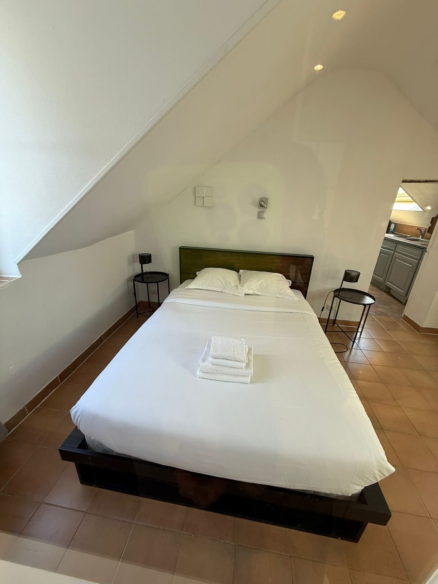 The bedroom overlooks an interior courtyard and includes a double bed with a superior quality mattress. Professionally laundered linens, comforters, pillows, and bath towels are provided for all guests.