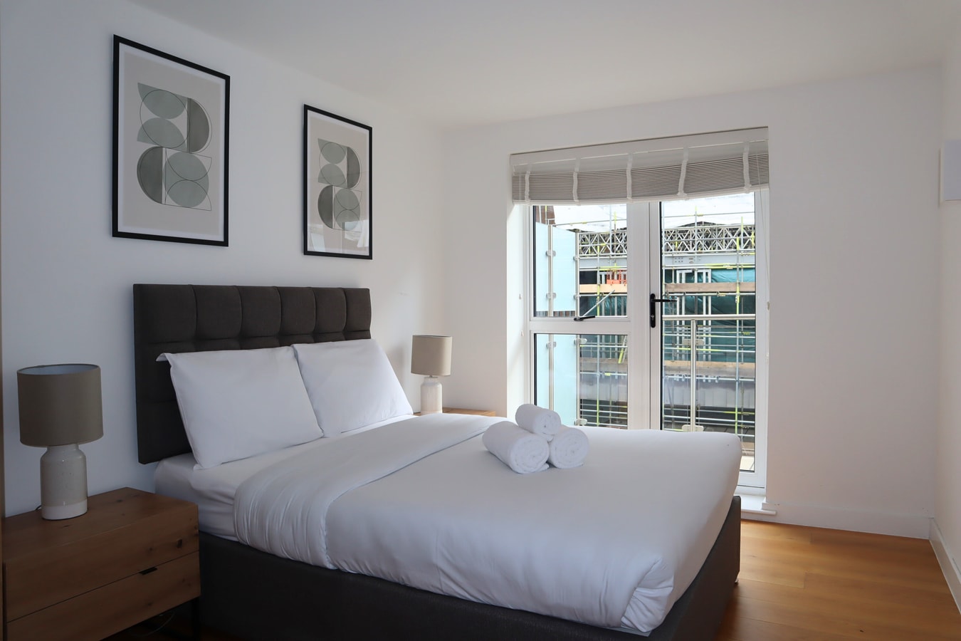 Both bedrooms are street-facing and include double beds with quality mattresses. Professionally laundered sheets, comforters, pillows, and bath towels are provided for each guest.