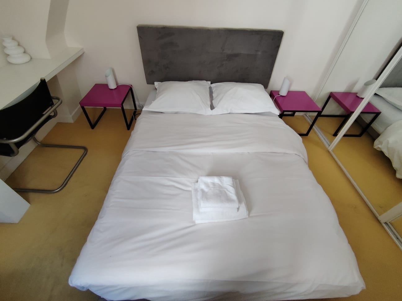 The bedroom is interior courtyard facing with a double bed with a superior quality mattress. Professionally laundered sheets, comforters, pillows and pillowcases are provided to you, as well as bath towels for each guest. The flat has one bathroom accessible via the hallway with a shower/bathtub, toilet, and sink. The bathroom is equipped with a hair dryer plus complementary toilet rolls, shampoo, shower gel and hand soap to start your stay.