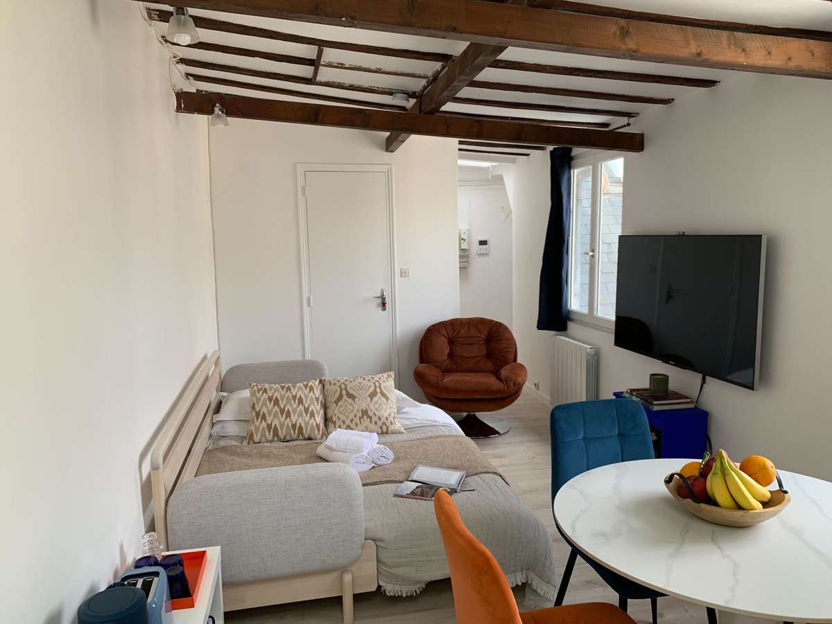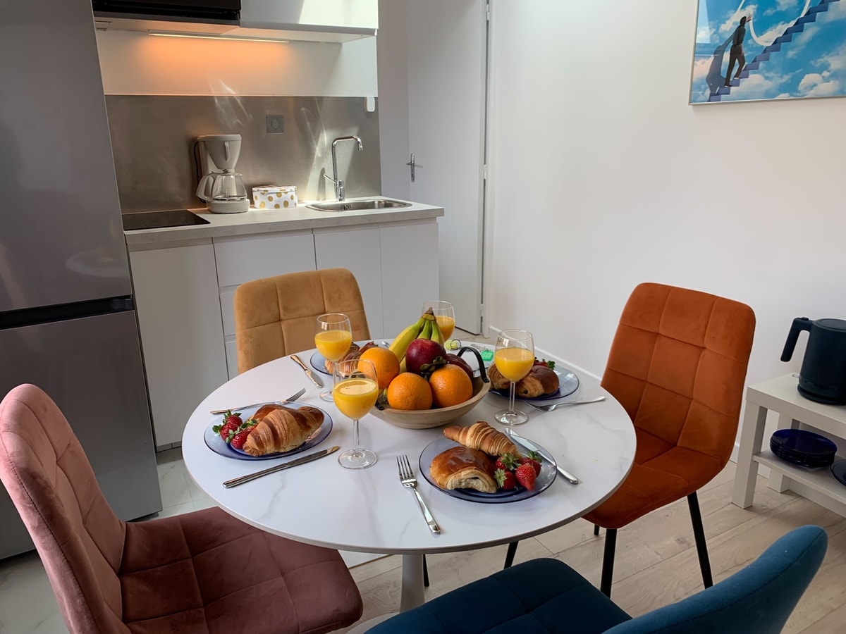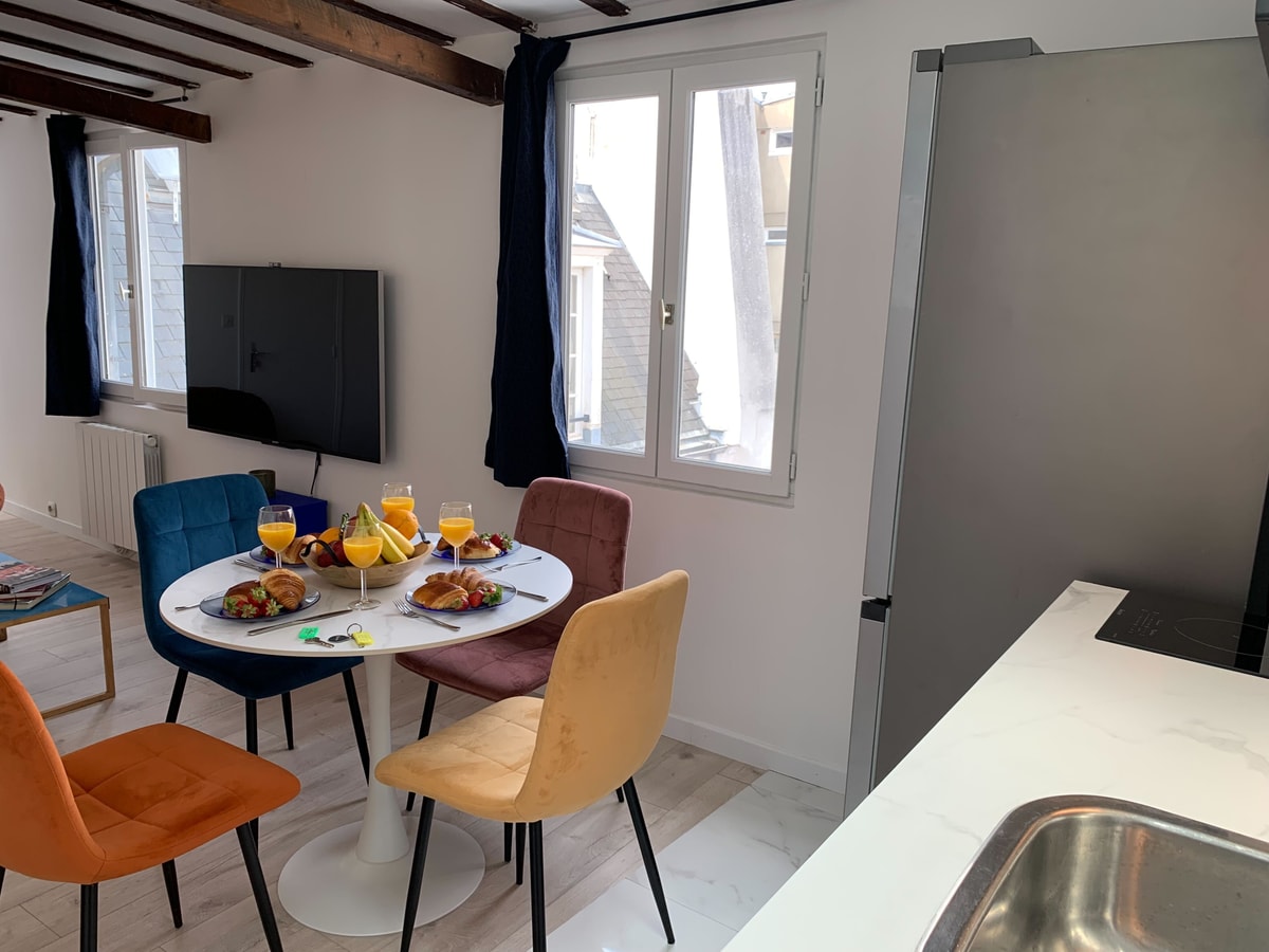 Experience the charm of Paris from this chic 1-bedroom apartment, ideally located in the heart of the Montorgueil Quarter. Situated on the 5th floor of a secure residential building (please note: no elevator), the apartment offers a stylish and comfortable retreat in one of the city's most vibrant neighborhoods. Enjoy convenient self check-in from 3:00 PM by collecting the keys at a nearby shop. Stay connected with ultra-fast 1 Gbps Wi-Fi—perfect for remote work or streaming your favorite content. A refundable damage deposit is required, in full accordance with the platform’s policies.