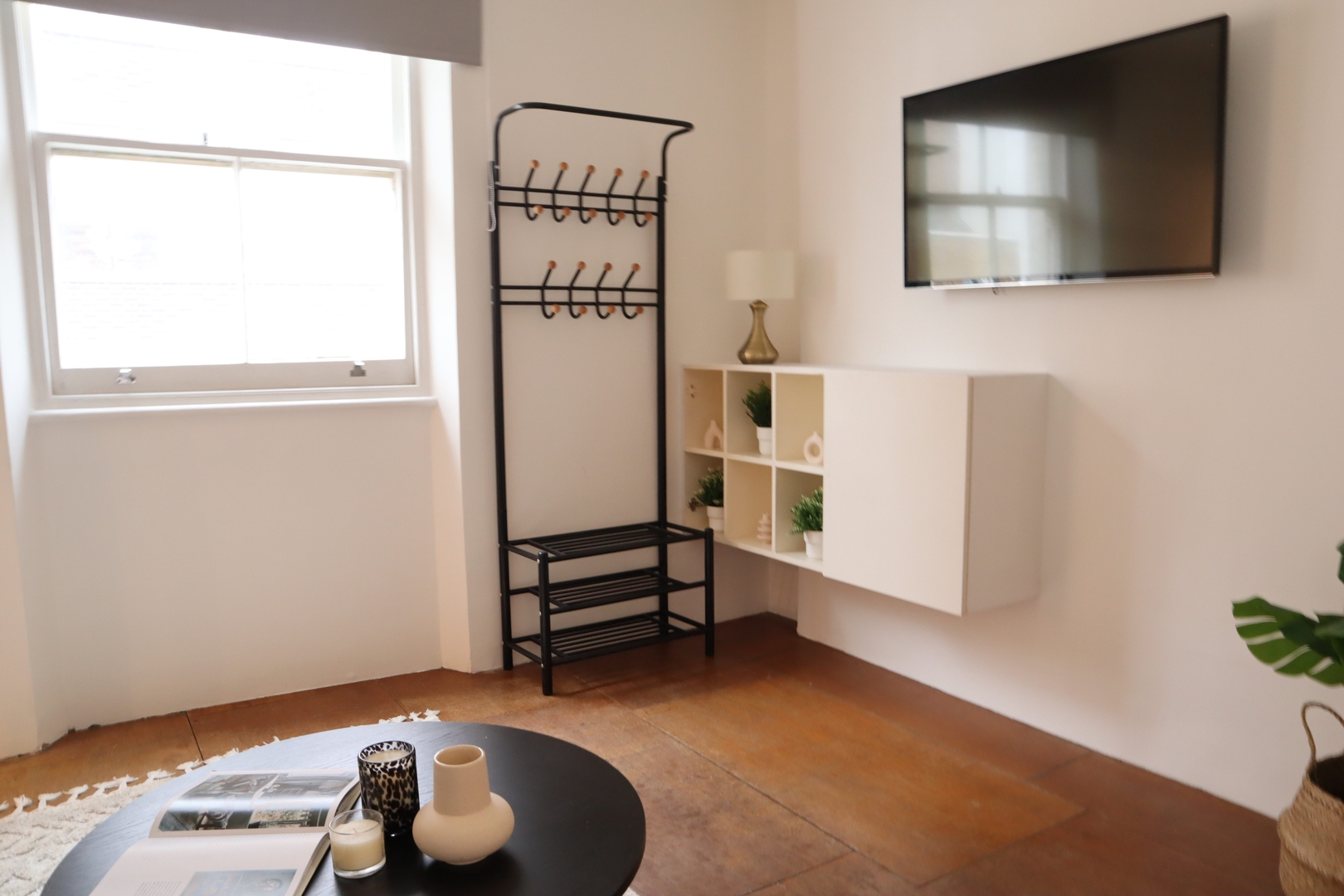 The bedroom is street-facing with a double size bed with a superior quality mattress. Professionally laundered sheets, comforters, pillows and pillowcases are provided to you, as well as bath towels for each guest. The flat has one bathroom accessible via the hallway with a shower, toilet and sink. The bathroom is equipped with a hair dryer plus complementary toilet rolls, shampoo, shower gel and hand soap to start your stay.